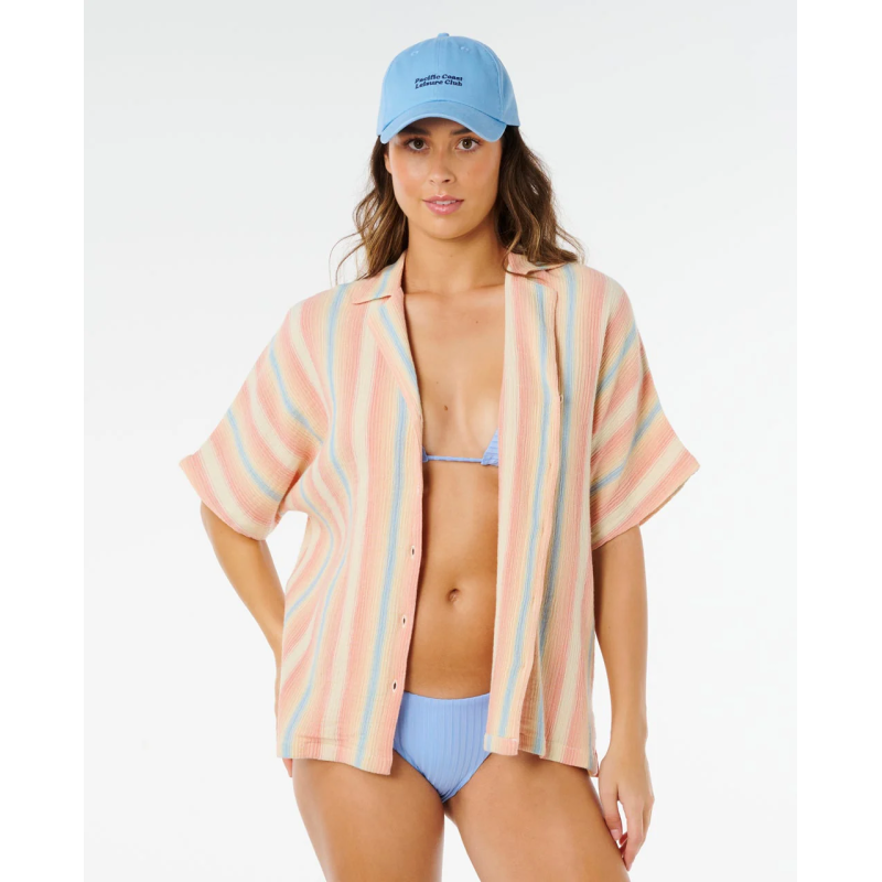 Une coupe décontractée et une gaze de coton douce font de la Premium Surf Stripe Short Sleeve Shirt un incontournable léger pour le surf, agrémentée d’un col revers et d’une patte de boutonnage pour un charme côtier.