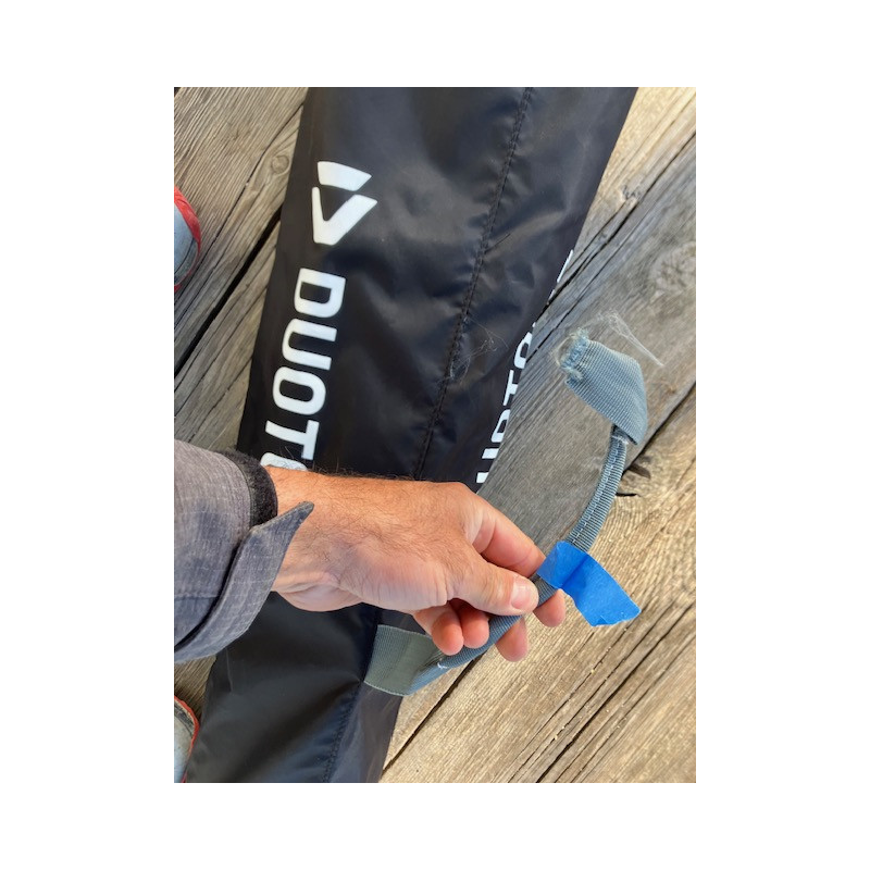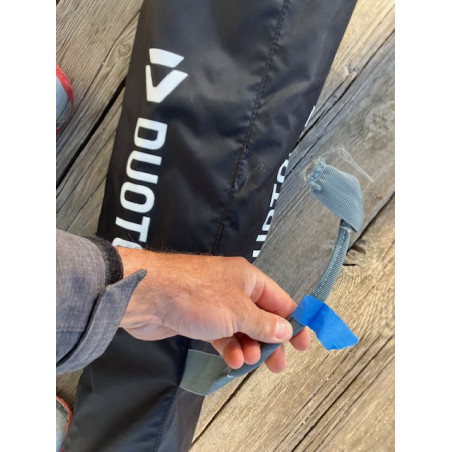 Le logo DUOTONE au-dessus de la fenêtre du wishbone permet d’ouvrir facilement le fourreau, de telle sorte que l’insertion du mât se fait sans devoir tirer constamment sur le fourreau et sans friction.
