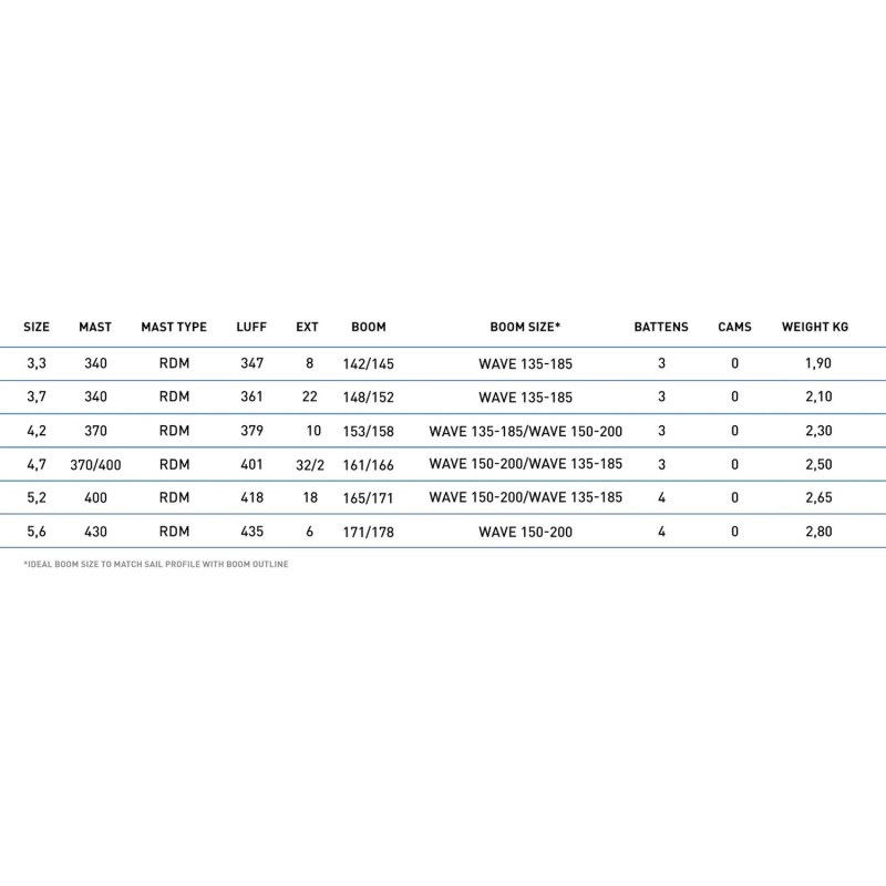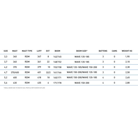 Contour, profil et géométrie des lattes spécifiquement conçus pour la vague, offrant une voile de vague axée sur la performance, très active, agile et joueuse dans le surf. Un profil légèrement plus profond à l'avant de la voile, combiné à un relâchement accru au guindant, améliore la propulsion avant de la voile ainsi que sa maniabilité à haute vitesse.