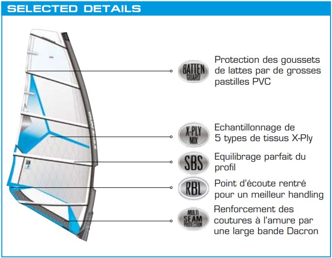 Son profil a été travaillé comme celui d’une voile de freeride pure telle que la FLASH, le tout agrémenté d’une bordure de voile de vagues et d’un rond de guindant sensiblement réduit tel celui d’une NEXUS.
