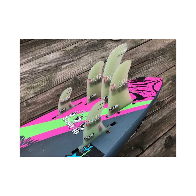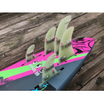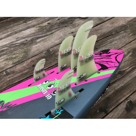 La Tabou Da Curve Quadster est livrée avec cinq ailerons et cinq boîtiers pour naviguer soit en quad soit en tri fin, en prenant soin de boucher les boîtiers non utilisés avec les obturateurs fournis.