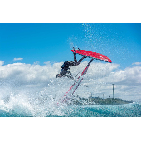Le nouveau shape de carène, plus rapide et plus efficace, associé à une longueur de rail accrue, apporte davantage de stabilité et de contrôle dans le gros surf, tout en améliorant les performances au près en float & ride (navigation non planante).