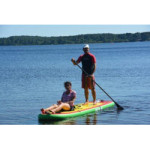 Planche de SUP en Kit complet : planche, pompe, sac à dos, 3 ailerons, pagaie aluminium ajustable 3 pièces et kit de réparation – Dimensions : 329x90x15 – poids : 12 kg – plié : 95x35x25 – vol 390 l – Gonflage en 9 min et dégonflage en 20 secondes. Fabrication en dropstitch MSL double peau avec zones de renfort triple peau sur la carène et les rails. La planche est équipée d’inserts permettant de fixer jusqu’a 2 siègeS Kayak, un gréement de windsurf et 3 ailerons US box. Pour plus de confort le pont est entièrement recouvert de mousse EVA.