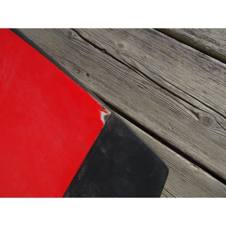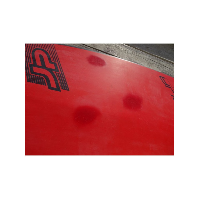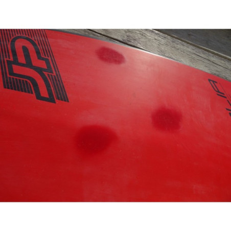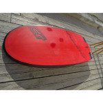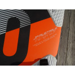 JP, précurseur en shapes dédiés au foil, propose une planche très courte et rectangulaire avec des rails épais.Ces rails sont couchés dès l’entre-jambes pour offrir une spatule douce sur un shape V double concave aboutissant sur de larges cut out carrés.Les footstrap sont très reculés.