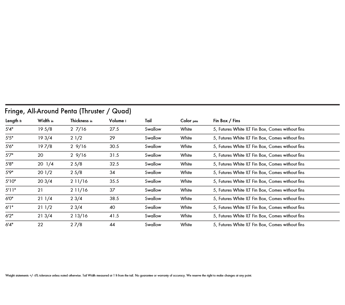 Nous avons ajouté un petit V sur le tail pour garder la planche sur le rail avec un rocker de tail plus tendu. Un swallow tail qui aide à obtenir plus de grip avec son tail épais. Elle est très vive, maintient sa vitesse et reste très rapide pour vos virages dans des vagues médiocres ou cafouilleuses. La Fringe est un must pour votre quiver.