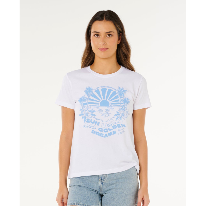 Le T-shirt Sun Beams Standard mise sur un style décontracté avec jersey coton stone wash et imprimé avant, complété par étiquette tissée pour un look surf classique.